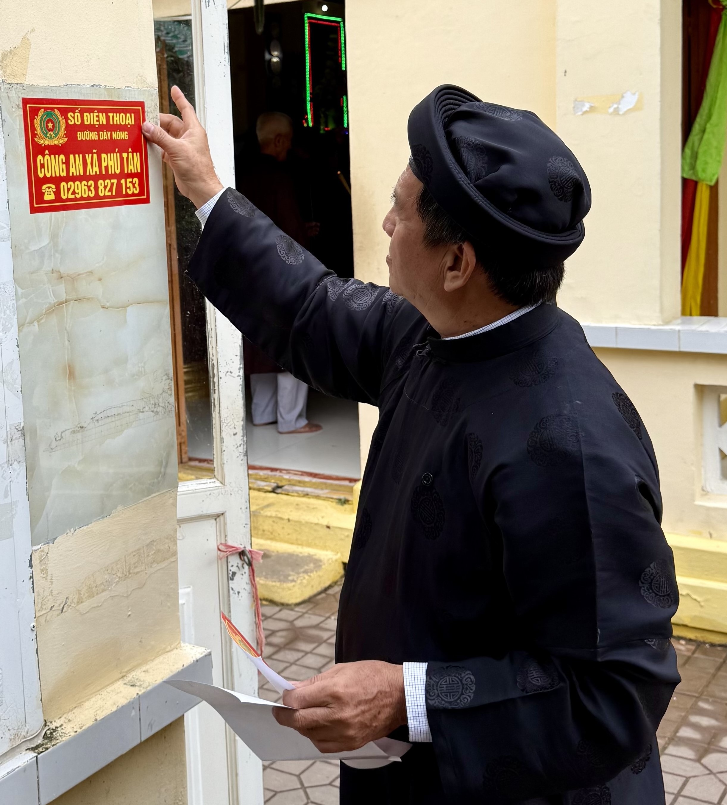 Sau buổi tuyên truyền Công an xã cùng bà con tín đồ gắn bảng số điện thoại đường dây nóng để người dân kịp thời tố giác tội phạm và phản ánh vụ việc liên quan ANTT.