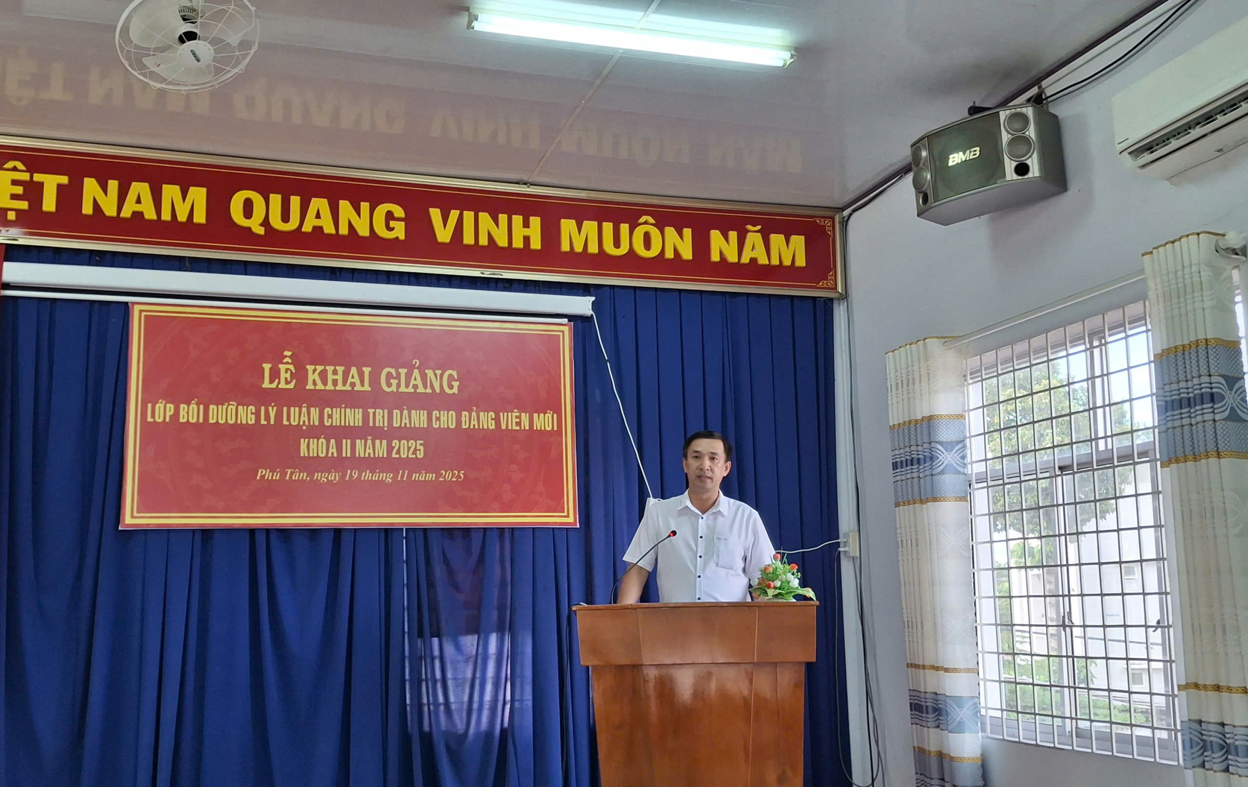 Đ/c Nguyễn Ngọc Hưng – Phó Bí thư thường trực Đảng ủy xã Phú Tân phát biểu tại buổi khai giảng lớp học LLCT dành cho Đảng viên mới