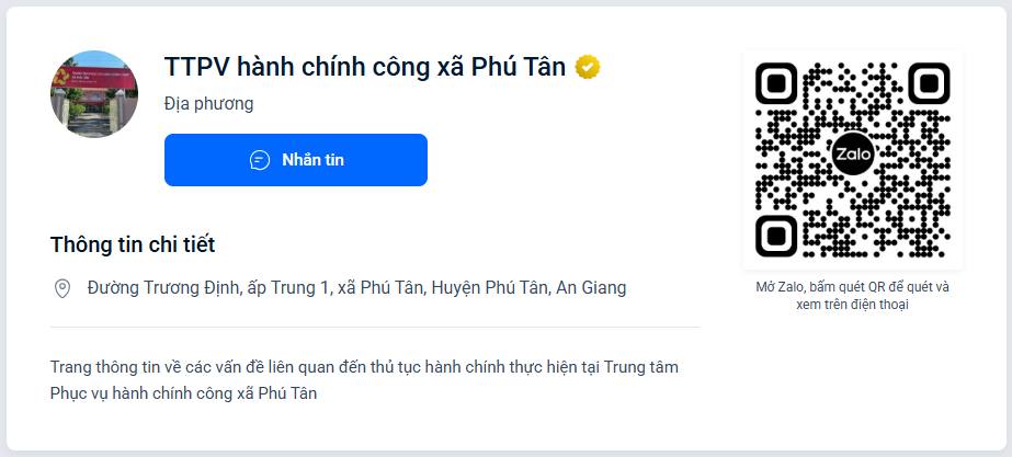 Người dân, tổ chức và doanh nghiệp có thể dễ dàng theo dõi Trang Zalo OA của Trung tâm Phục vụ hành chính công xã Phú Tân bằng một trong các cách sau:
