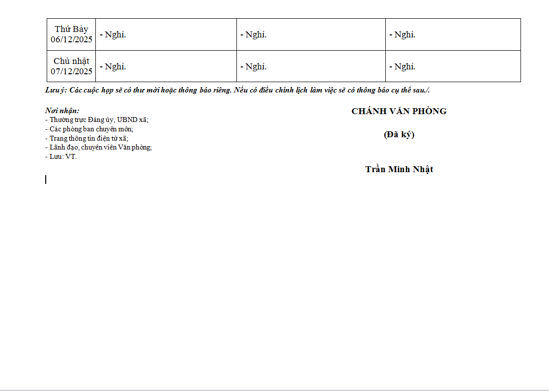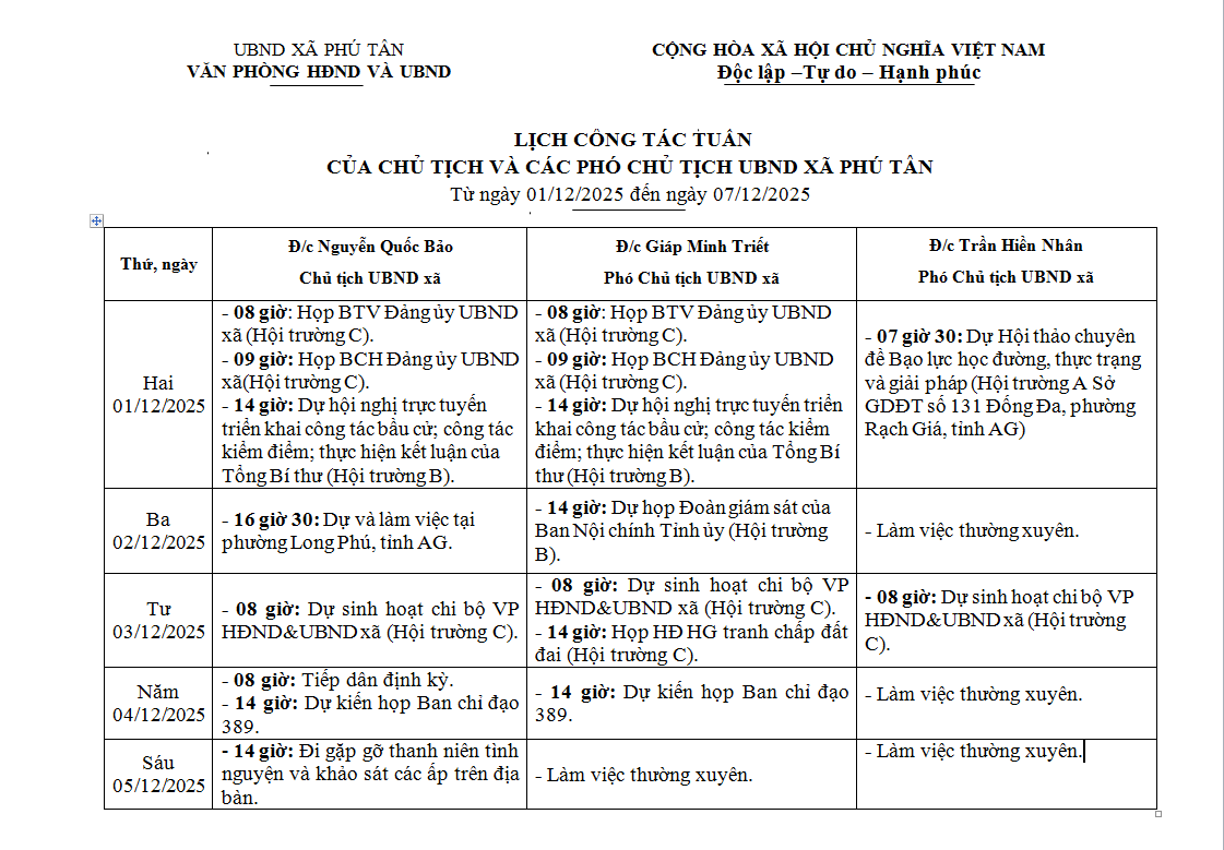 Lịch làm việc của TT. UBND xã từ 01-12 đến 05-12-2025 Lịch làm việc của UBND 01/12/2025 - aA + /lich-lam-viec-cua-tt-ubnd-xa-tu-01-12-den-05-12-2025 Tin khác Lịch công tác tuần của Thường trực UBND xã từ ngày 02/02 đến ngày 08/02/2026 Lịch làm việc của UBND 02/02/2026 LỊCH CÔNG TÁC TUẦN CỦA CHỦ TỊCH VÀ CÁC PHÓ CHỦ TỊCH UBND XÃ PHÚ TÂN (từ ngày 26/01 đến ngày 01/02/2026) Lịch làm việc của UBND 26/01/2026 Lịch làm việc của TT. UBND xã từ 05-01 đến 11-01-2026 Lịch làm việc của UBND 05/01/2026 Lịch làm việc của TT. UBND xã từ 15-12 đến 21-12-2025 Lịch làm việc của UBND 19/12/2025 Lịch làm việc của TT. UBND xã từ 08-12 đến 14-12-2025 Lịch làm việc của UBND 09/12/2025 Lịch làm việc của TT. UBND xã từ 24-11 đến 30-11-2025 Lịch làm việc của UBND 27/11/2025