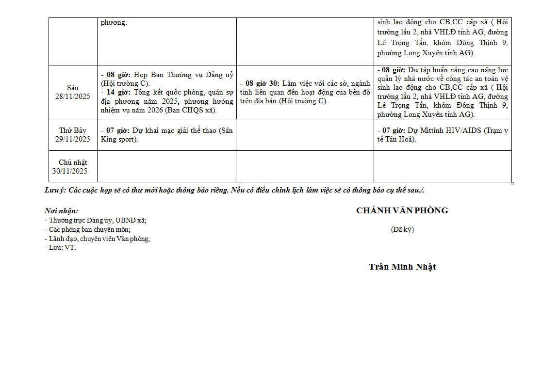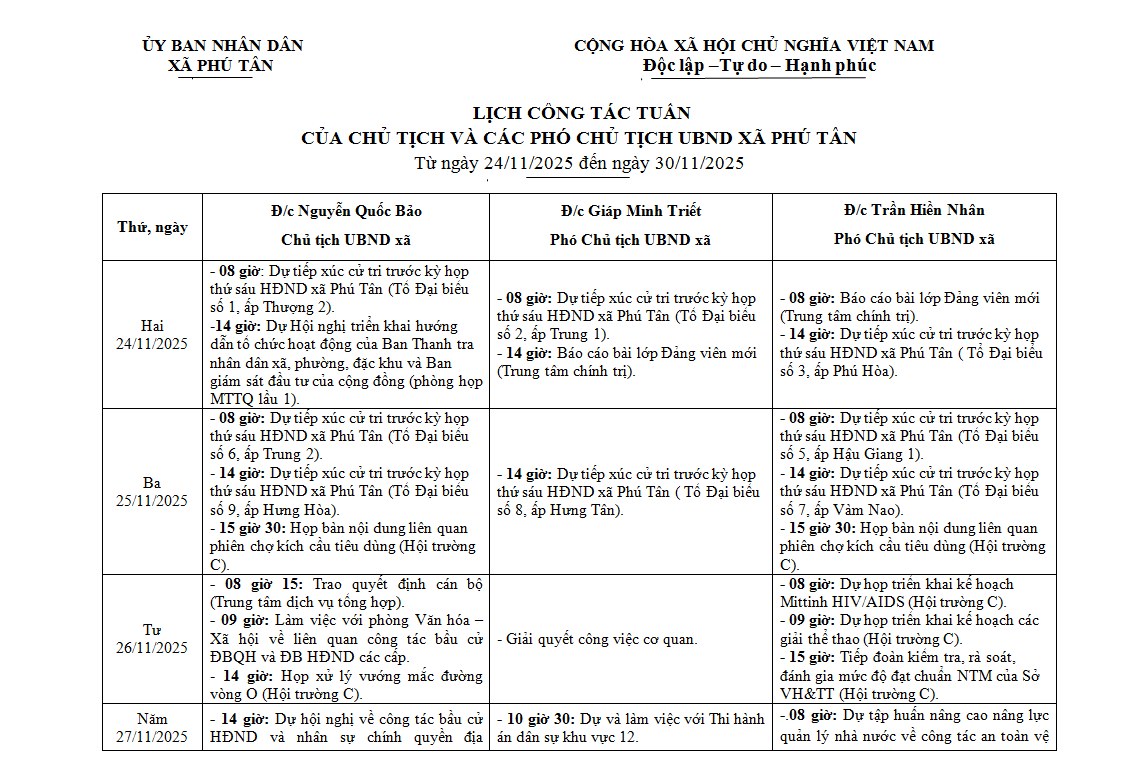 Lịch làm việc của TT. UBND xã từ 24-11 đến 30-11-2025 Lịch làm việc của UBND 27/11/2025 - aA + /lich-lam-viec-cua-tt-ubnd-xa-tu-24-11-den-30-11-2025 File đính kèm Lich lam viec TTUBND tu 24-11 den 30-11-2025.docx (30.23 KB) Tin khác Lịch công tác tuần của Thường trực UBND xã từ ngày 02/02 đến ngày 08/02/2026 Lịch làm việc của UBND 02/02/2026 LỊCH CÔNG TÁC TUẦN CỦA CHỦ TỊCH VÀ CÁC PHÓ CHỦ TỊCH UBND XÃ PHÚ TÂN (từ ngày 26/01 đến ngày 01/02/2026) Lịch làm việc của UBND 26/01/2026 Lịch làm việc của TT. UBND xã từ 05-01 đến 11-01-2026 Lịch làm việc của UBND 05/01/2026 Lịch làm việc của TT. UBND xã từ 15-12 đến 21-12-2025 Lịch làm việc của UBND 19/12/2025 Lịch làm việc của TT. UBND xã từ 08-12 đến 14-12-2025 Lịch làm việc của UBND 09/12/2025 Lịch làm việc của TT. UBND xã từ 01-12 đến 05-12-2025 Lịch làm việc của UBND 01/12/2025