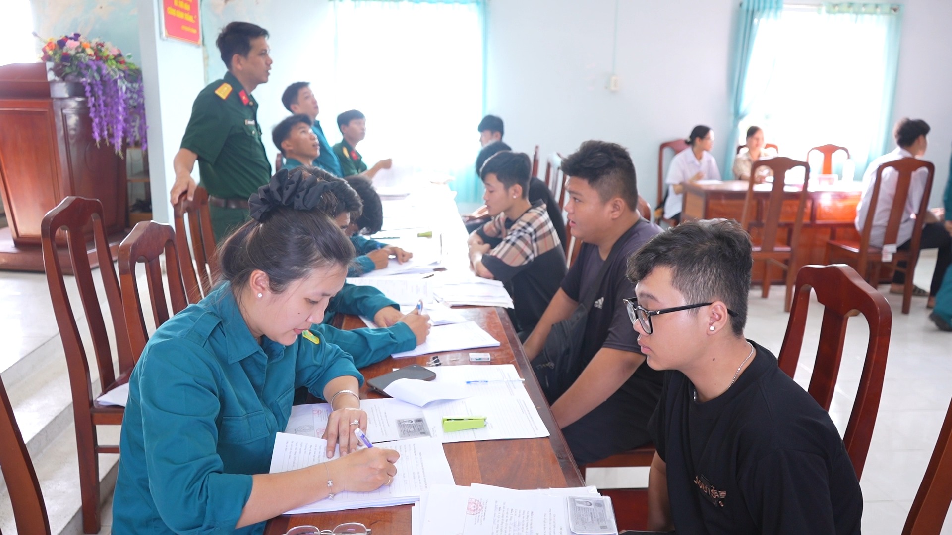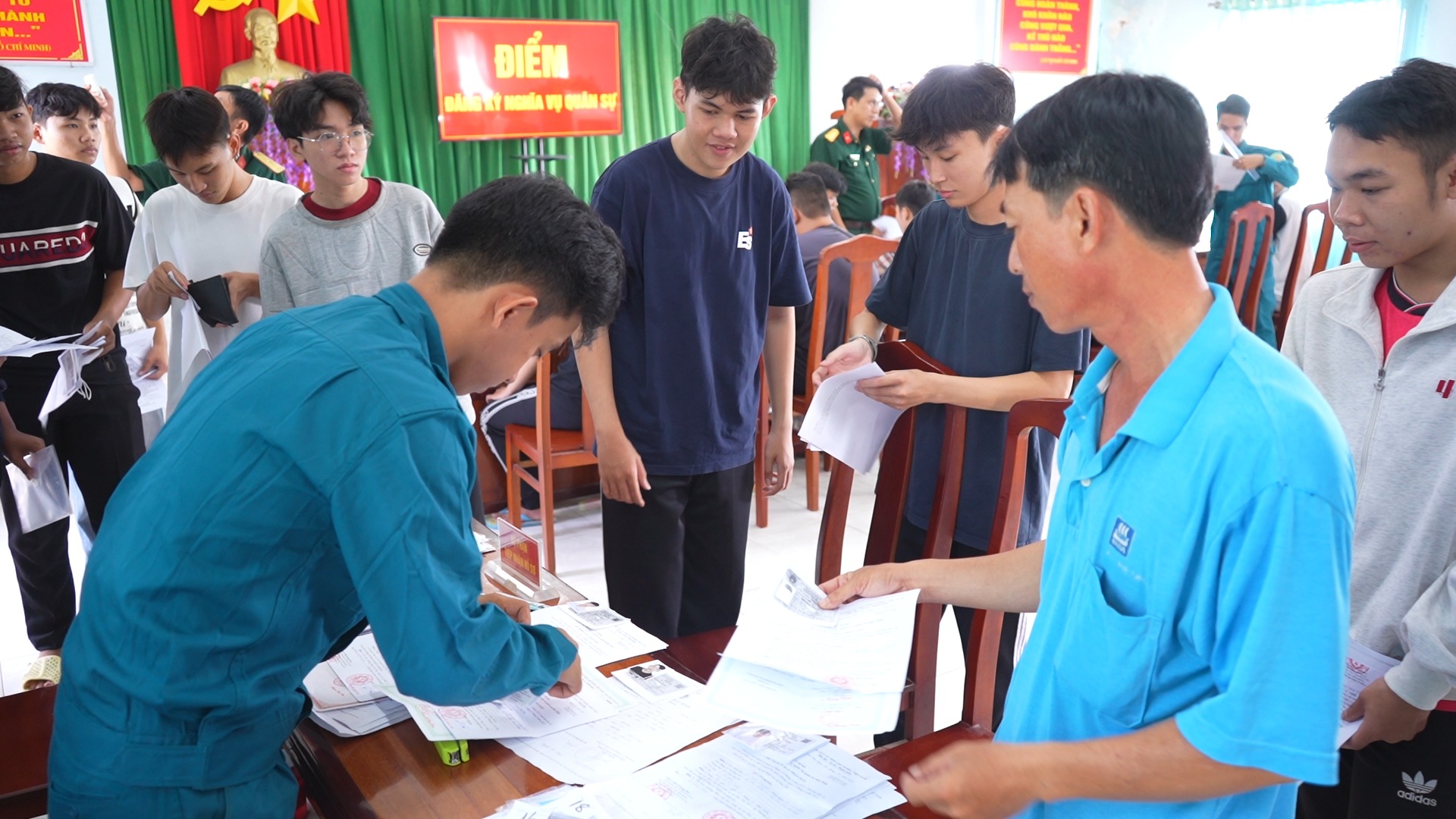 Tại điểm đăng ký, lực lượng chức năng tiến hành kiểm tra hồ sơ, lý lịch, trình độ học vấn, nghề nghiệp và tình trạng sức khỏe ban đầu; đồng thời hướng dẫn công dân kê khai đầy đủ, chính xác các nội dung theo quy định. Công tác đăng ký được triển khai nghiêm túc, đúng trình tự, thủ tục; bảo đảm công khai, dân chủ và đúng luật.