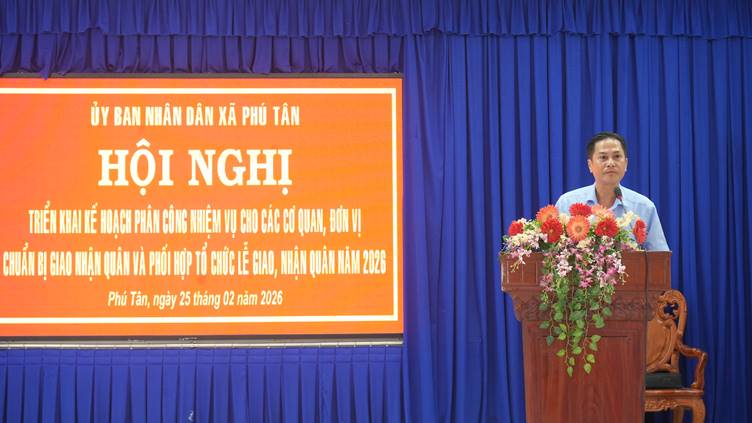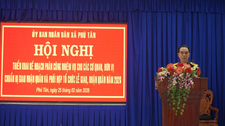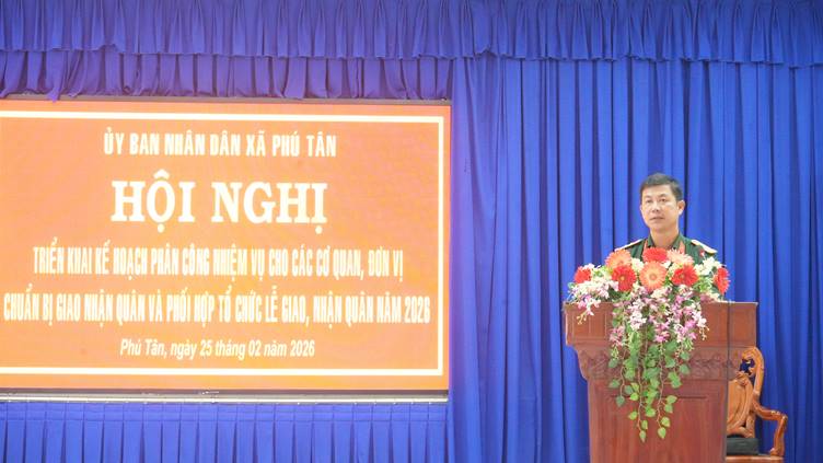 Nhằm triển khai tốt công tác tuyển chọn, gọi công dân nhập ngũ và chuẩn bị chu đáo cho Lễ giao, nhận quân năm 2026, Chiều ngày 25/02, Ủy ban nhân dân xã Phú Tân tổ chức hội nghị phân công nhiệm vụ cho các cơ quan, đơn vị trên địa bàn.