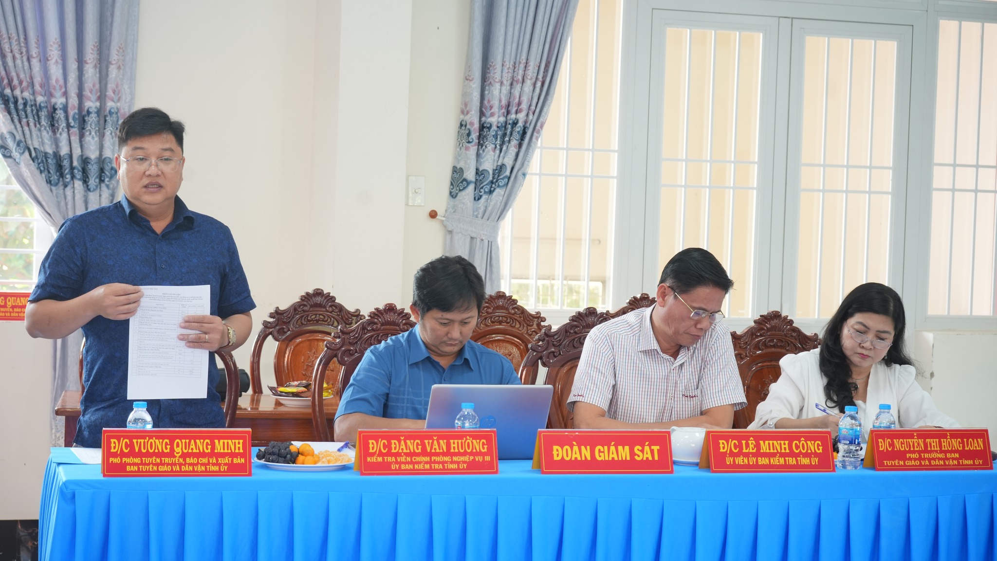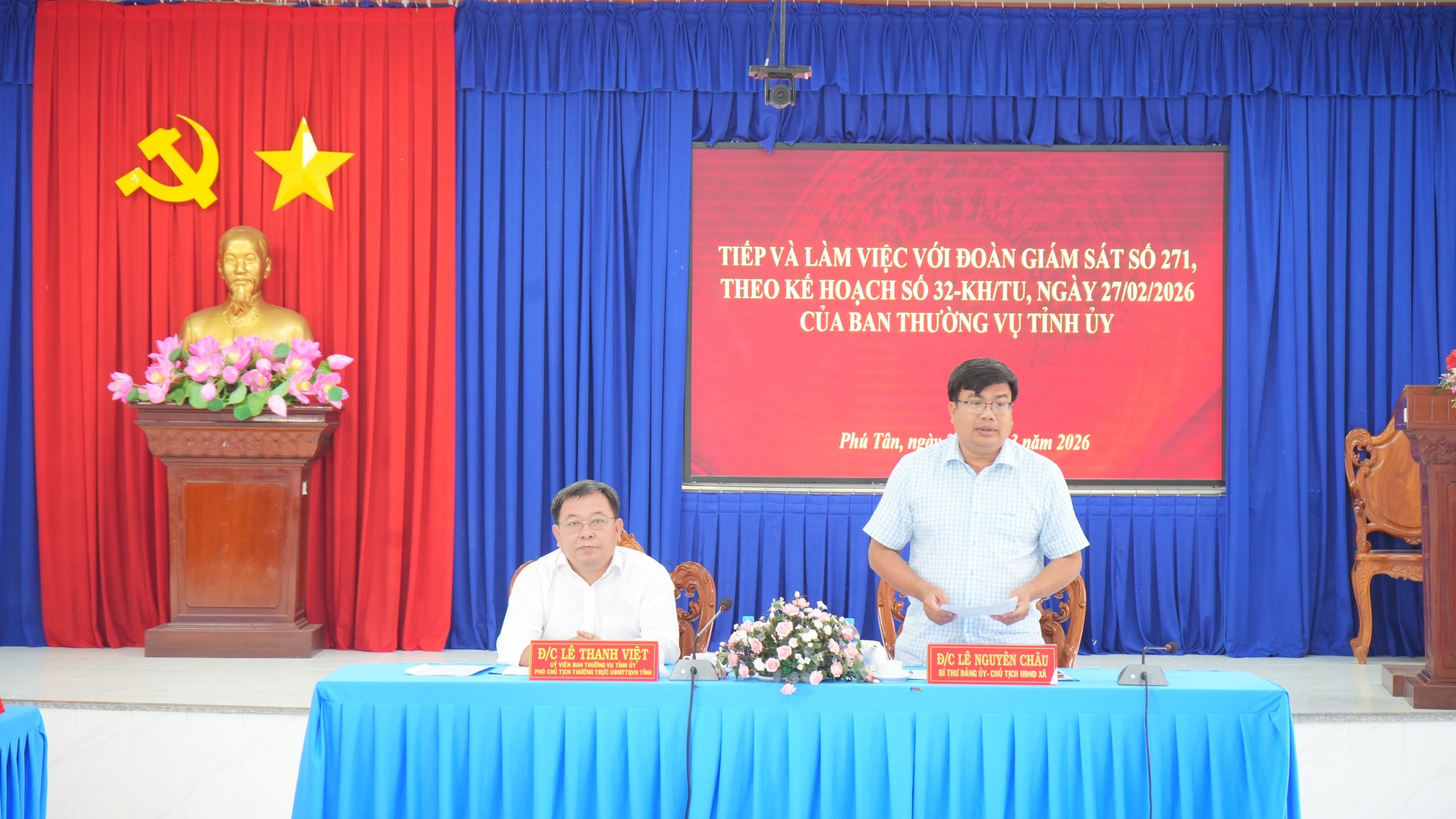 Tại buổi làm việc, Đảng ủy xã Phú Tân đã báo cáo với đoàn giám sát về tình hình tổ chức nghiên cứu, học tập, quán triệt Nghị quyết Đại hội XIV của Đảng đến cán bộ, đảng viên và nhân dân trên địa bàn. Theo đó, Đảng ủy xã đã xây dựng kế hoạch và tổ chức 05 lớp hội nghị tập trung dành riêng cho đảng viên với số lượng tham gia đạt hơn 95% và 02 hội nghị tập trung cho cán bộ, công chức, đoàn viên, hội viên và người lao động chưa là đảng viên với tỷ lệ tham gia đạt trên 94%. Đồng thời, chỉ đạo các chi bộ trực thuộc tổ chức lồng ghép triển khai trong sinh hoạt định kỳ, đảm bảo 100% đảng viên được học tập, nghiên cứu nghị quyết.